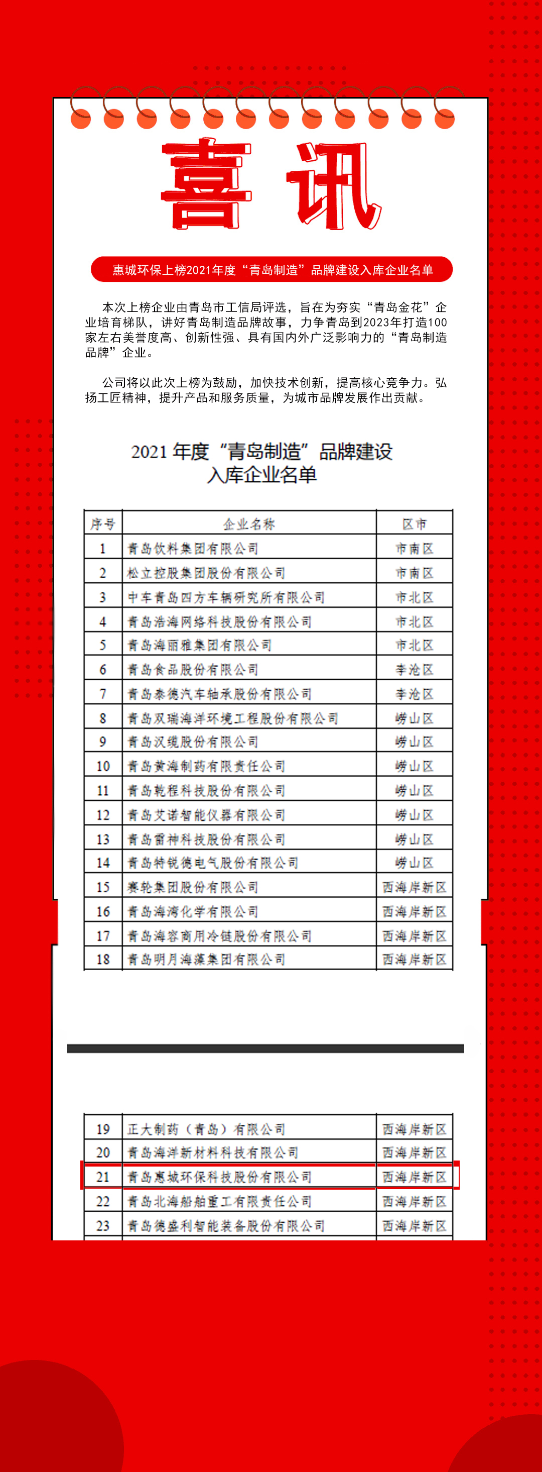 熱烈祝賀公司上榜2021年度“青島制造”品牌建設入庫企業名單